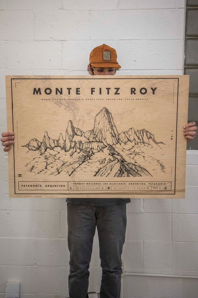 A two tone 25x35" limited edition screen print of Mount Fitzroy. There are 5 signed edition wood prints. This is the first in a series that Artist Andy Earl and myself will be doing of iconic climbing destinations from around the world. The screens have since been destroyed, so get them while you can.